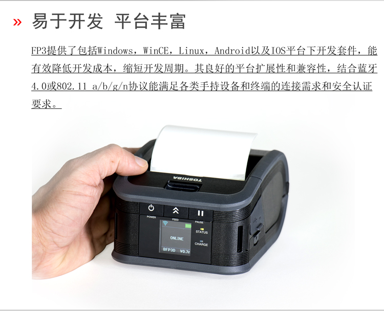 東芝將高性能移動(dòng)打印技術(shù)帶到你的手中,F(xiàn)P3D標(biāo)準(zhǔn)版3寸便攜式熱敏打印機(jī),擁有6IPS(152mm/s)高速打印、彩色中文液晶屏等技術(shù),蘊(yùn)含著東芝對(duì)于便攜性、可靠性和高性能的承諾,滿足各類便攜打印的應(yīng)用需求。