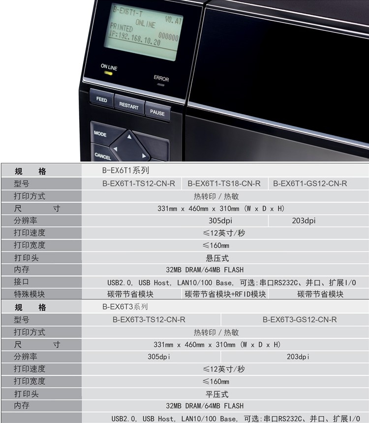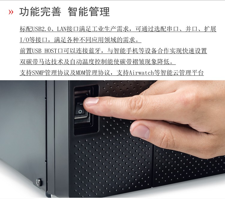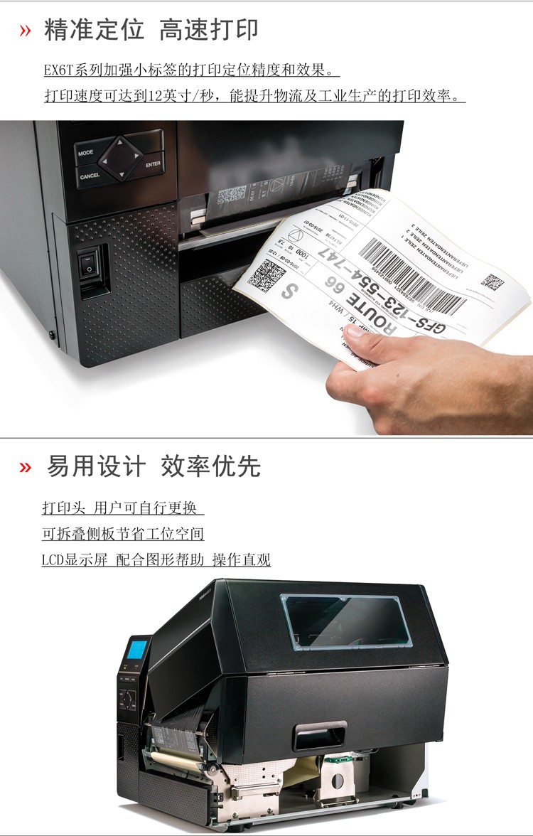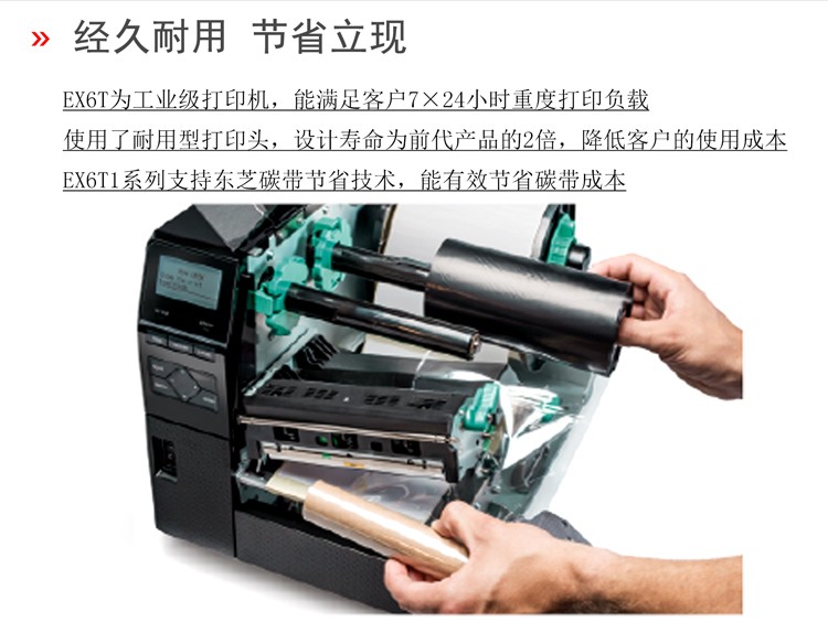 具有12IPS打印速度、結(jié)合先進的打印溫度和步進控制技術(shù),能滿足各類標(biāo)簽打印的需求,懸壓打印技術(shù)和碳帶節(jié)省功能,能極大地降低客戶使用成本,提升投資回報率。EX6T1堅固耐用,結(jié)合RFID及諸多人性化、智能化設(shè)計,提供寬幅工業(yè)標(biāo)簽打印應(yīng)用。